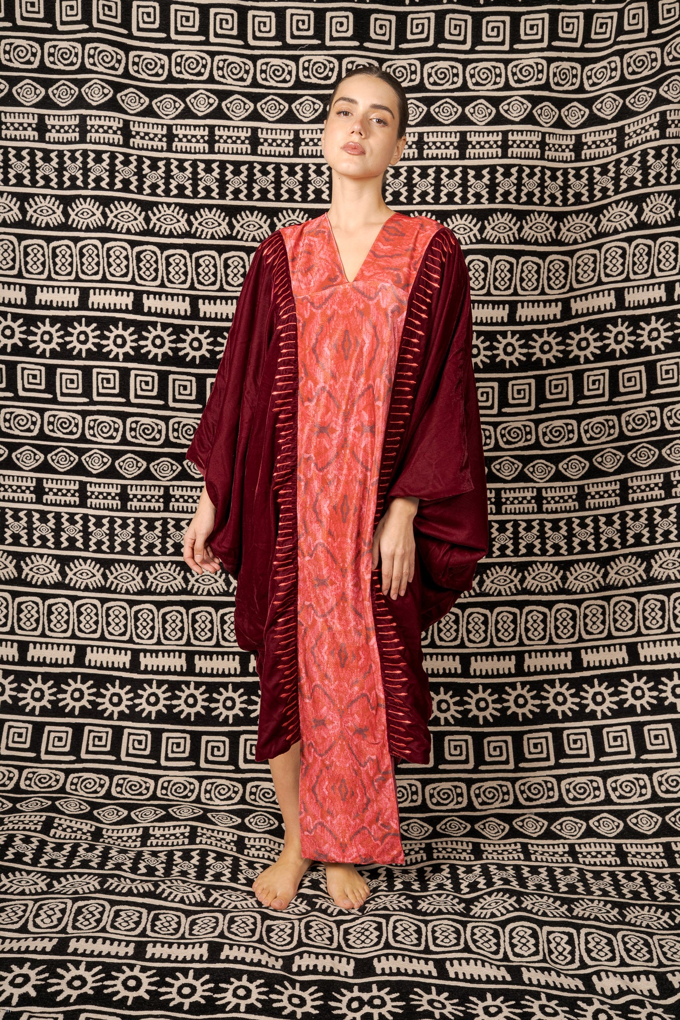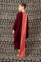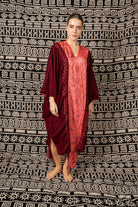Elevate your wardrobe with this Light Maroon Velvet Kaftan, crafted from premium velvet for a soft, rich texture and a fluid, elegant drape. The design features a striking central ikat-inspired woven panel in contrasting tones, adding modern artistry while preserving a refined, understated aesthetic.