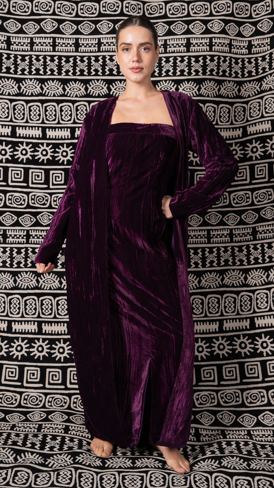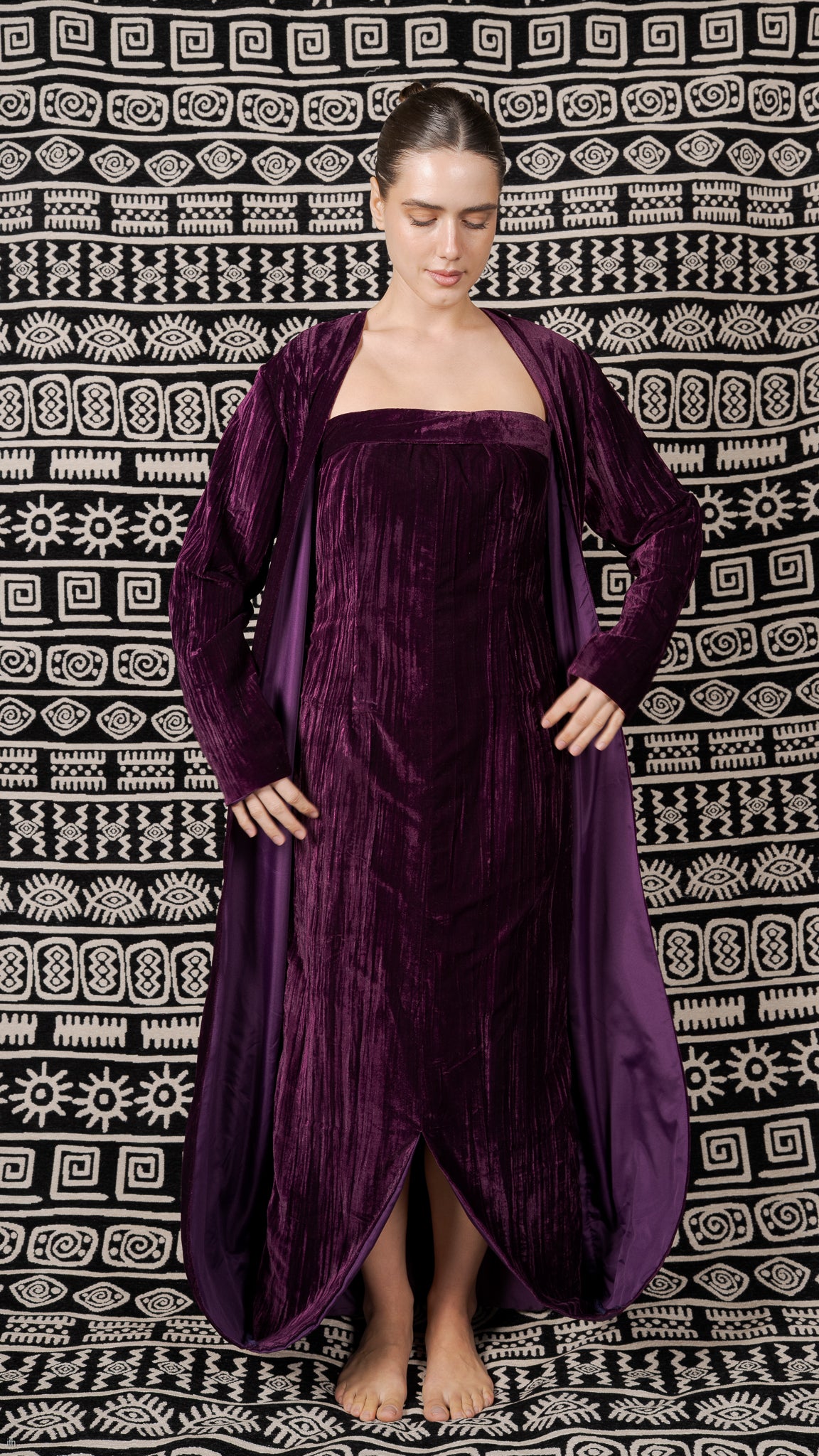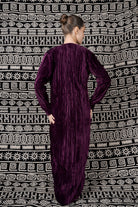 Purple Crushed Velvet Dress with Attached Draped Coat